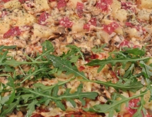 De rest ...... naar eigen smaak! Bijvoorbeeld: (beetje gebakken) uienringetjes, ananas, ham, spinazie, rucola (naderhand), schijfjes tomaat, mozzarella ....... en niet te vergeten: italiaanse (biologische) gedroogde kruiden.